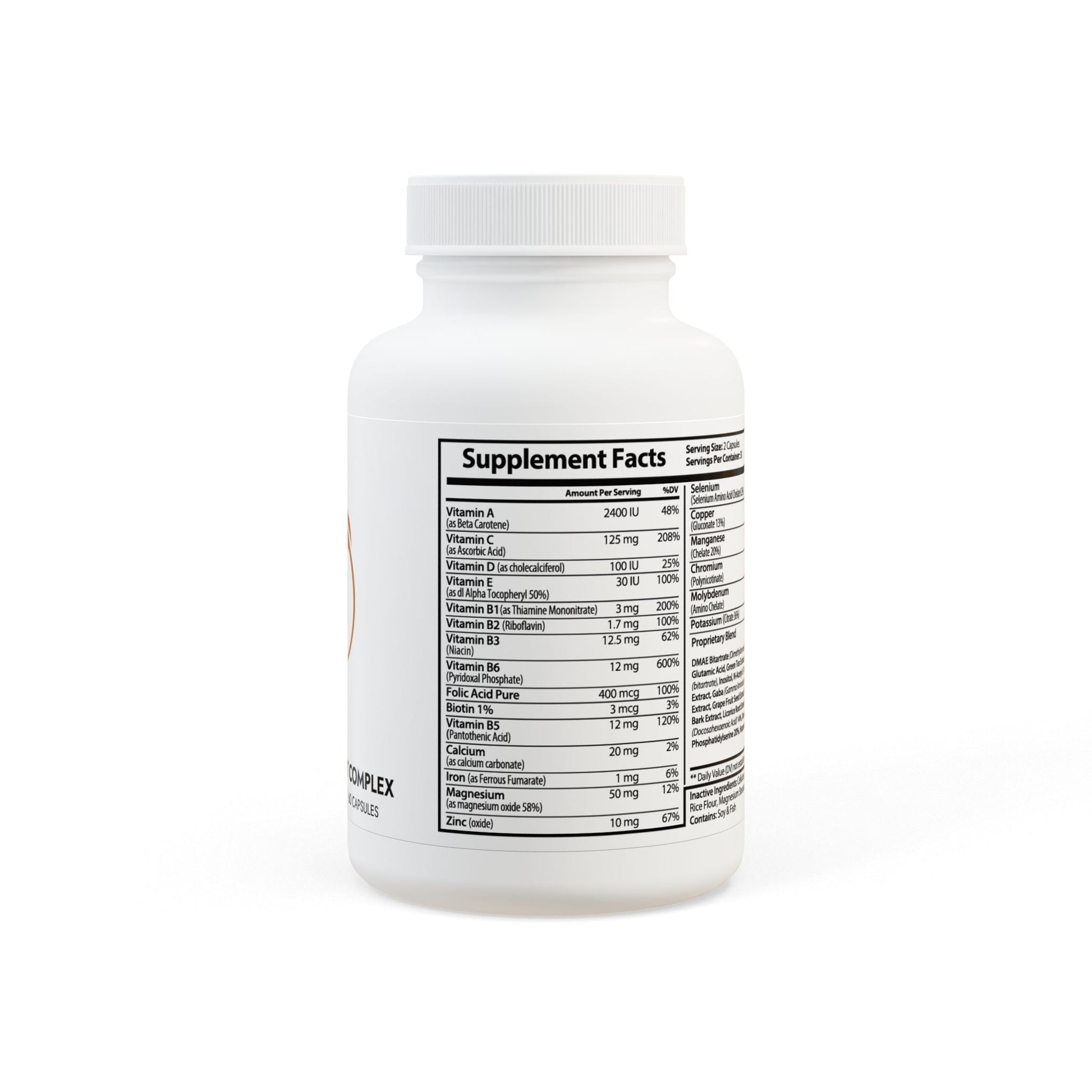 Ingredients: Vitamin A (as Beta Carotene), Vitamin C (as Ascorbic Acid), Vitamin D (as cholecalciferol), Vitamin E (as dl Alpha Tocopheryl 50%), Vitamin B1(as Thiamine Mononitrate), Vitamin B2 (Riboavin), Vitamin B3 (Niacin), Vitamin B6 (Pyridoxal Phosphate), Folic Acid Pure, Biotin, Vitamin B5 (Pantothenic Acid), Calcium (as calcium carbonate), Iron (as Ferrous Fumarate), Magnesium (as magnesium oxide 58%), Zinc (oxide), Selenium (Selenium Amino Acid Chelate 0.2%), Copper (Gluconate 13%), Manganese (Chelate 20%), Chromium (Polynicotinate), Molybdenum (Amino Chelate), Potassium (Citrate 36%), DMAE Bitartrate (Dimethylaminoethanol), L Glutamine, Glutamic Acid, Green Tea Extract, Bacopa Extract, Choline (bitartrate), Inositol, N-Acetyl L-Tyrosine, Bilberry Fruit Extract, Gaba (Gamma Aminobutyric Acid), Grape Seed Extract, Grape Fruit Seed Extract, Olive Leaf, Cinnamon Bark Extract, Licorice Root Extract, Boron (Citrate), DHA (Docosahexaenoic Acid) 14%, Vanadyl Sulfate 19%, Phosphatidylserine 20%, Huperzine A. Inactive Ingredients: Cellulose (Vegetable Capsule), Rice Flour, Magnesium Stearate, Silicon Dioxide. Contains: Soy & Fish